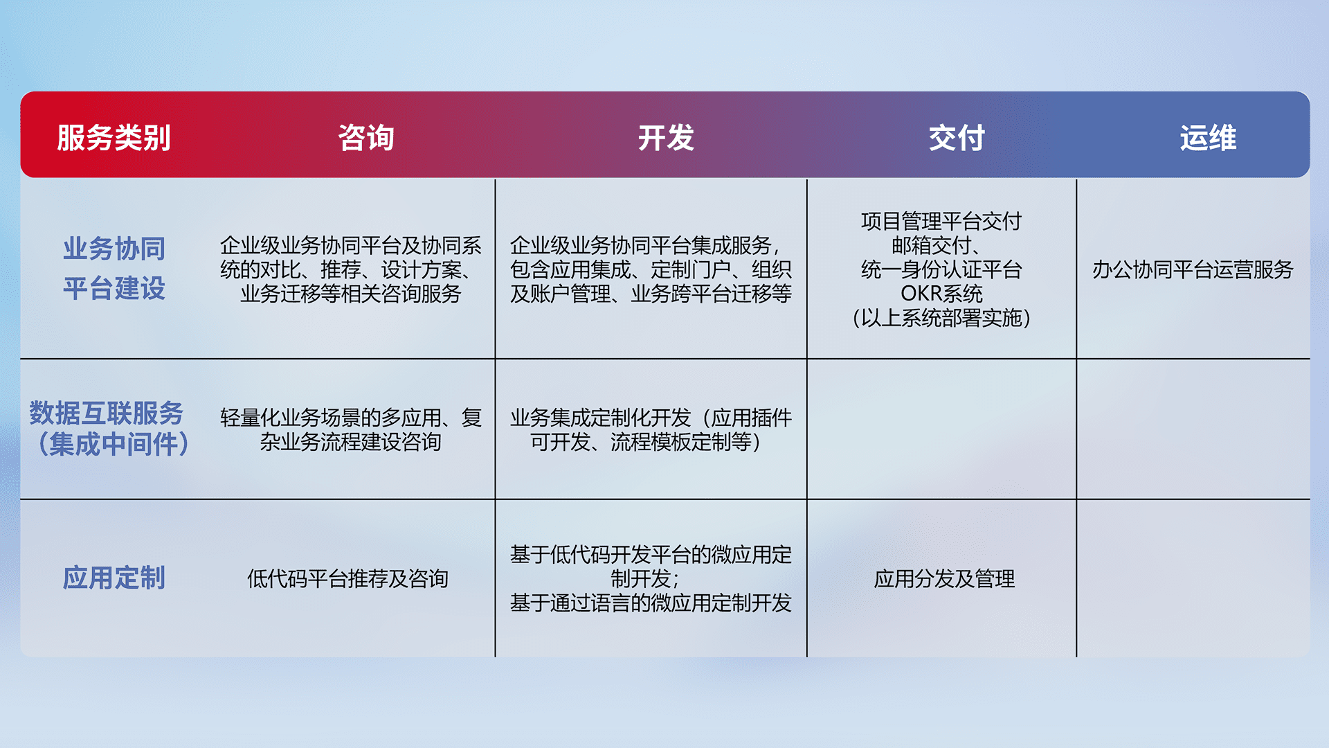 针对钉钉、、、企微、、、、IDaas等平台级产品提供产品的规划、、、方案、、、交付、、、、定制化开发等服务,,,实现如统一协同办公、、智能客户服务、、、、混合会议管理、、、智能数据查询、、、、等业务场景,,,实现数字化转型。。。。